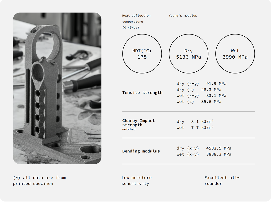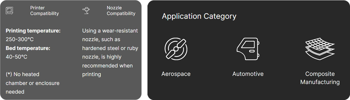 Fiberon™ PA612-CF15 is a carbon fiber reinforced polyamide filament based on a copolymer of PA6 and PA12. Thanks to its chemical structure, this product has lower moisture sensitivity compared to PA6/66 and PA6-based materials, and better mechanical properties than PA12-based materials. In addition, the carbon fiber reinforcement and Warp-free technology enhance the dimensional stability of the prints produced with this material.