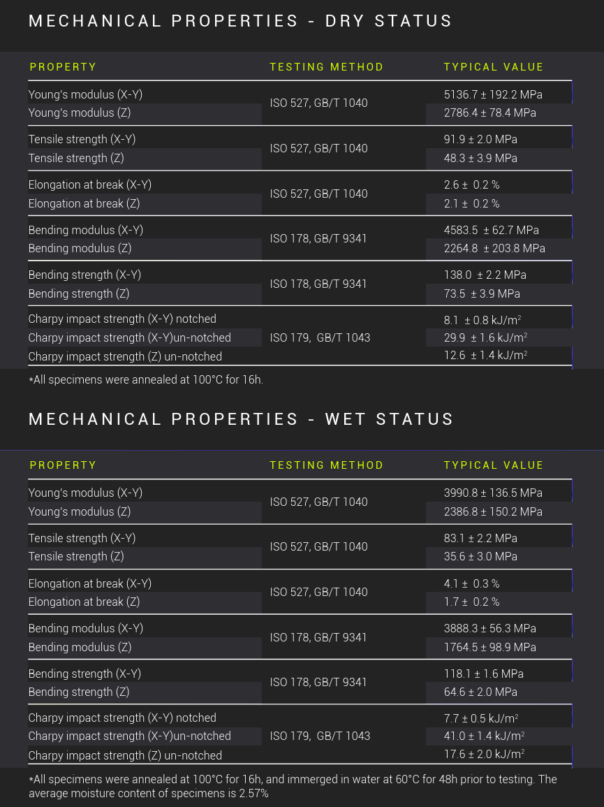 Fiberon™ PA612-CF15 exhibits enhanced rigidity and strength in wet conditions compared to Fiberon™ PA6-CF20, owing to its longer chemical chain. While both materials do absorb moisture, PA612-CF demonstrates minimal reduction in mechanical properties, resulting in superior overall performance in wet environments when compared to PA6-CF.