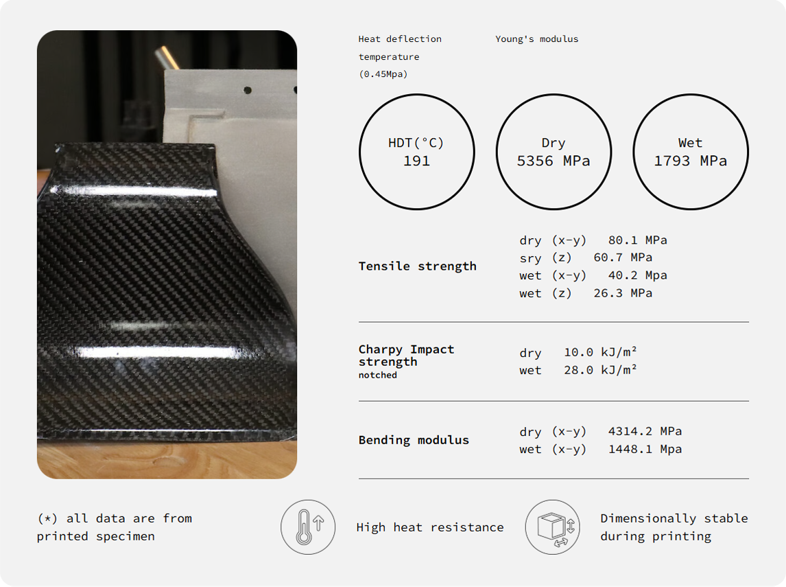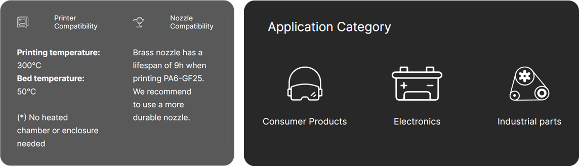 Fiberon™ PA6-GF25 is a glass fiber reinforced Nylon 6 filament. The material exhibits excellent thermal and mechanical properties without sacrificing the layer adhesion or printability. Fiberon™ PA6-GF25 is strong, durable and features a heat deflection temperature of 191°C. It can be used in applications where stiffness and durability are paramount.
