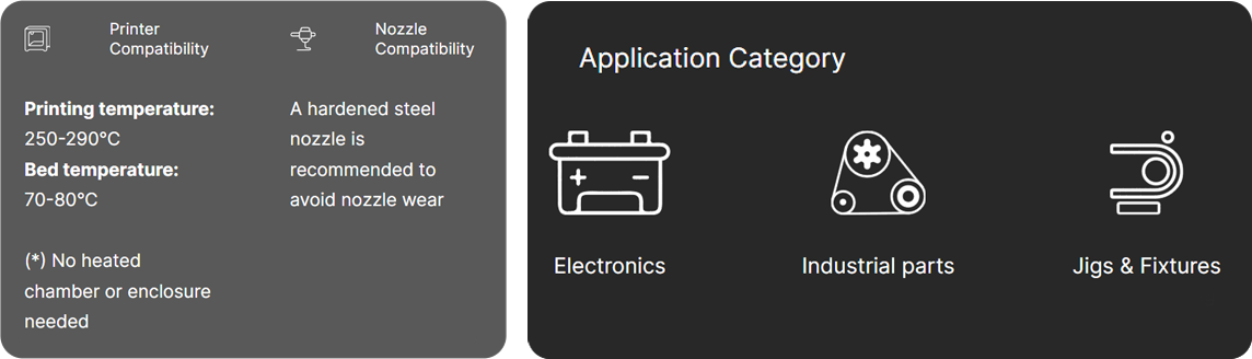 To ensure the ESD (Electrostatic Discharge) property of printed parts when using Fiberon™ PETG-ESD, it is recommended to print at a minimum temperature of 250°C, moreover, because of the added carbon nanotubes, please use a hardened steel nozzle.