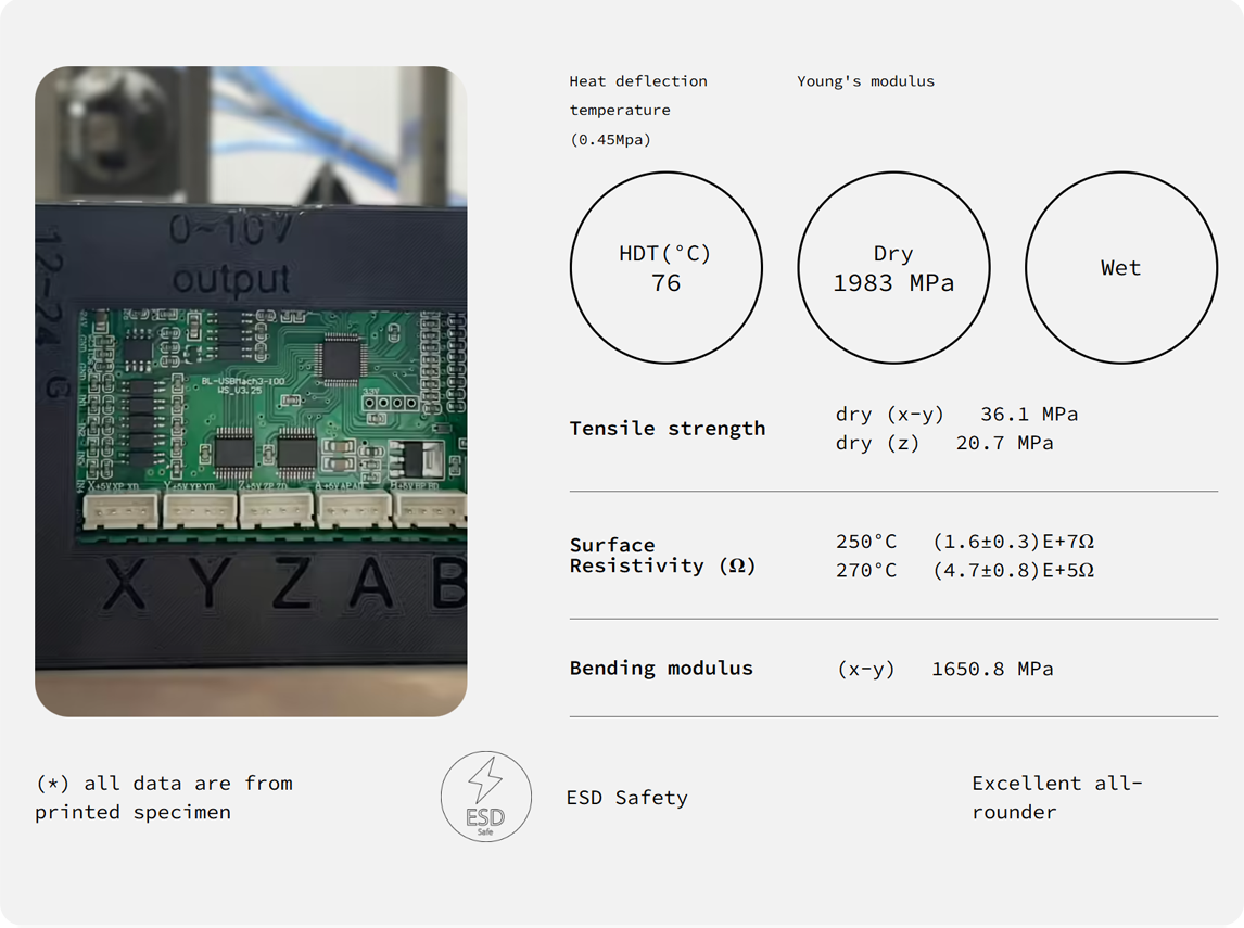 Fiberon™ PA612-ESD is a next-generation nylon composite filament engineered with carbon nanotubes and carbon fibers for enhanced mechanical durability and electrostatic dissipation. Protect your sensitive electronics by 3D printing ESD housings or streamline your production process with ESD safe jigs & fixtures that are not only tough but also heat resistant to 157°C.